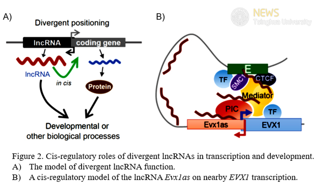 Genomic juxtaposition of divergent lncRNA and protein-coding genes suggests a potential regulatory link. To test this hypothesis, Sai Luo, a graduate student and the first author in the paper, knocked down a number of lncRNAs and protein-coding genes that were randomly picked. Remarkably, depletion of 75% divergent lncRNAs led to downregulation of nearby genes, while protein-coding transcripts had a neglectable effect on nearby transcription. Some lncRNA knockdown elicited global expression changes in developmental programs known to involve nearby transcription factors. In-depth characterization of the divergent Evx1as/EVX1 locus revealed a direct role for the Evx1as lncRNA transcripts to promote EVX1 transcription in cis, and to regulate stem cell differentiation. At a single-cell level, early broad expression of Evx1as is followed by a rapid, high-level transcription of EVX1, supporting the idea that Evx1as plays an upstream role to facilitate EVX1 transcription. Mechanistically, Evx1as RNA binds to regulatory sites on chromatin, promotes an active chromatin state and interacts with Mediator.