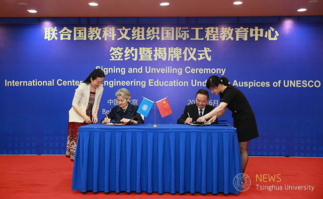 The Signing and Unveiling Ceremony of International Center for Engineering Education under the Auspices of UNESCO was held in Beijing on the morning of June 6, 2016. Irina Bokova, Director-General of United Nations Educational, Scientific, and Cultural Organization(UNESCO), Zhou Ji, director of the Chinese Academy of Engineering (CAE), Wu Qidi, the former vice-minister of the Ministry of Education (MOE), Qiu Yong, president of Tsinghua University, Yang Bin, vice-president of Tsinghua university and executive director of International Center for Engineering Education of UNESCO attended this ceremony. Zhao Xian’geng, a Party member of the CAE, presided over this event.