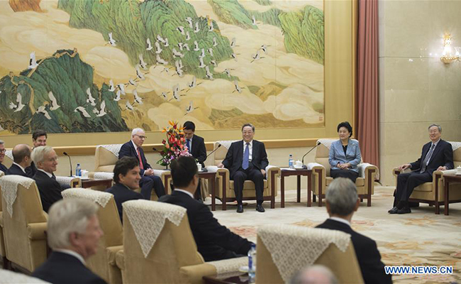 Yu Zhengsheng, chairman of the National Committee of the Chinese People's Political Consultative Conference, meets with members of the Advisory Board of Tsinghua University School of Economics and Management, in Beijing, capital of China, Oct. 20, 2016, calling on them to offer more advice on China's economic development.