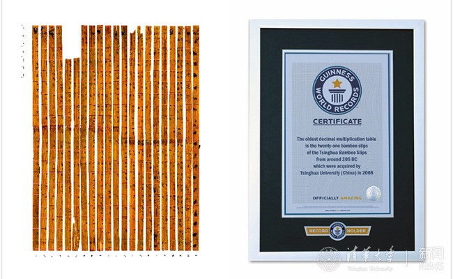 The Suanbiao, a bamboo-slip manuscript of twenty-one bamboo slips in the Tsinghua collection, is a decimal multiplication table for numbers up to 99.5 when it is reconstructed in the correct order. It was awarded the Guinness World Record for “the oldest decimal multiplication table” in the world on April 23, 2017.