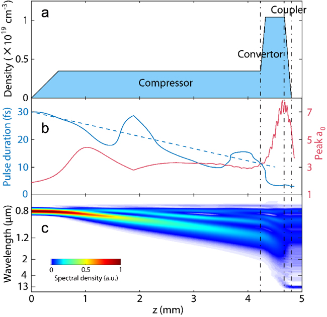 Interestingly, in addition to a "charged particle accelerator", a laser wakefield is also a "photon decelerator" for the laser pulse. The drive laser loses its energy to produce wakes, while at the same time the frequency of the laser photons decreases (the wavelength increases), and its equivalent velocity (group velocity) in the plasma slows down ("photon deceleration"). From another perspective, this process is a nonlinear frequency conversion process of ultra-intense laser in plasma, an effect very similar to optical self-phase modulation in common crystals or gases. The key difference is that plasma is a highly flexible and customizable medium, and it can easily support ultra-intense light fields. Therefore, "photon deceleration" in a specially designed plasma structure has great potential in producing long-wavelength intense laser pulses. Finding a suitable structure to solve the longstanding challenge of generating near-single-cycle intense mid-infrared laser pulses with a wavelength longer than 5μm becomes a meaningful research area to explore. With this goal in mind, Professor Wei Lu and Associate Professor Chih-Hao Pai have advised PhD student Zan Nie to conduct in-depth analysis and large-scale particle-in-cell simulations in this field, and found a "sandwich" plasma structure that can satisfy the goal of efficiently generating intense near-single-cycle infrared pulses in the range of 5-14 μm (Fig. 2).