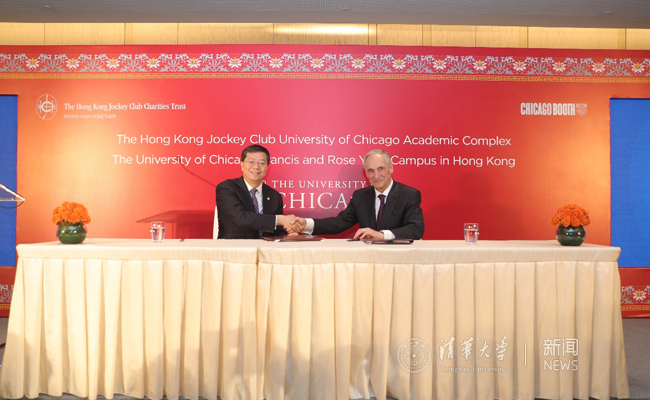 On November 29th, the signing ceremony of the Tsinghua University-University of Chicago Joint Research Center for Economics and Finance was held at the campus of the University of Chicago in Hong Kong. President Qiu Yong of Tsinghua University and President Robert J. Zimmer of the University of Chicago signed a memorandum of understanding on cooperation. The two universities will jointly establish the Tsinghua University-University of Chicago Joint Research Center for Economics and Finance. Provost Daniel Diermeier, Vice President for Strategy and Innovation, Deputy Provost and Chief International Officer Balaji Srinivasan, Vice President for National Laboratories Juan de Pablo, Vice President for Communications Paul Rand, and Vice President for Alumni Relations and Development Sharon Marine of the University of Chicago, Former President Gu Binglin and Vice President and Provost Yang Bin of Tsinghua University and other guests had a meeting and attended the signing ceremony together.