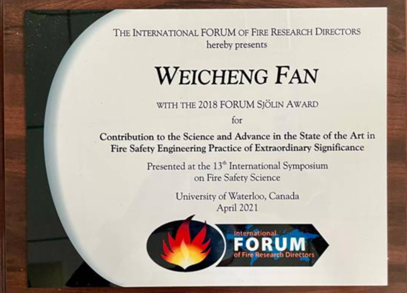 It is presented each year to the individual whose effort is primarily responsible for - or traceable to - a specific advance. Fan was announced as winner at the 2018-2020 International Symposium on Fire Safety Science, which is held once every three years.
