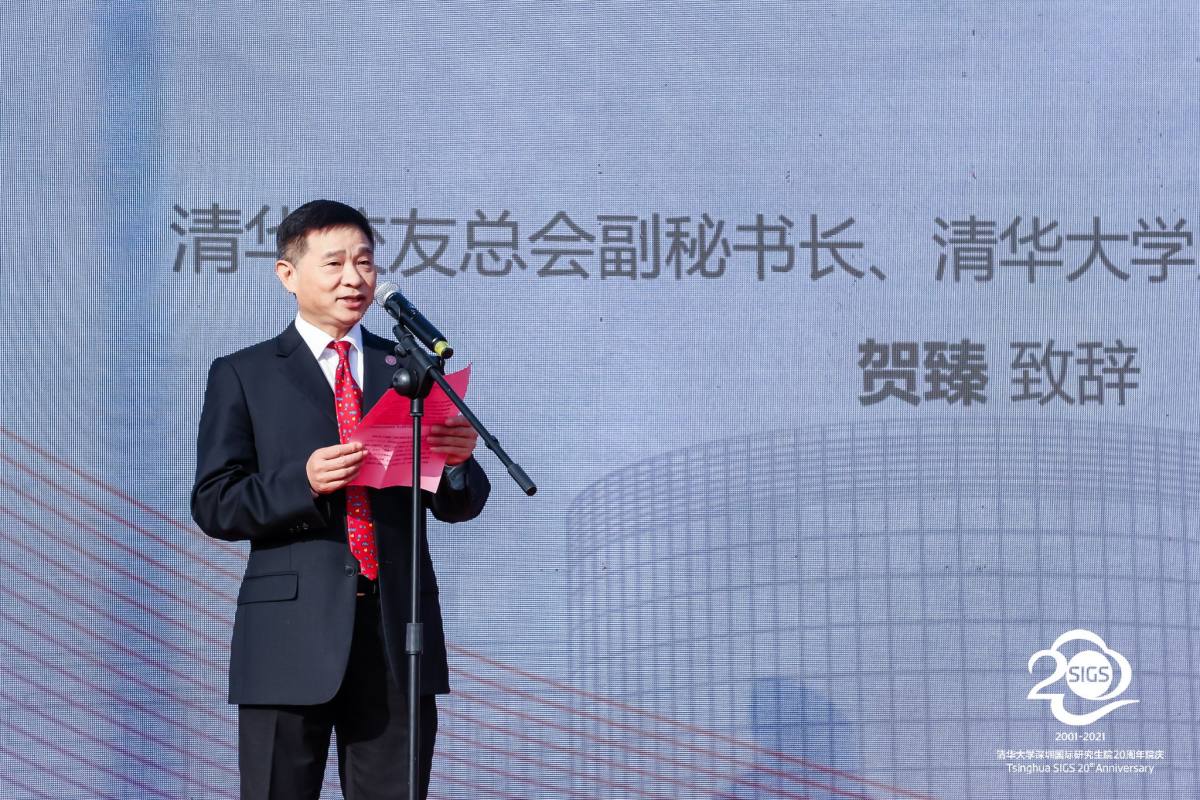 Later, He Zhen, deputy secretary-general of the Tsinghua Alumni Association and executive president of the Tsinghua Alumni Association of Guangzhou, spoke at the ceremony on behalf of alumni: “Since SIGS announced the opening of donations for the Junzi statue project this April, members of Tsinghua alumni associations in Guangzhou, Shenzhen, Dongguan, and other cities have responded enthusiastically. Thanks to alumni’s generosity, a wonderful birthday gift was presented to Tsinghua and SIGS.”