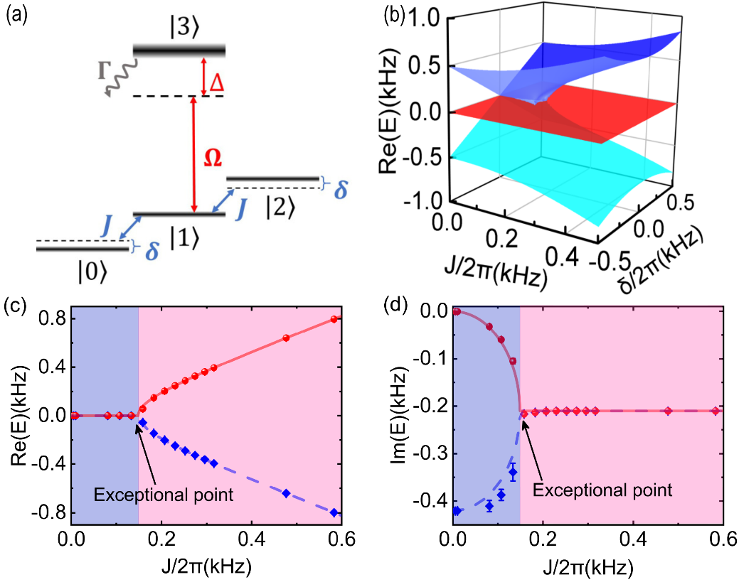 The research team led by Prof. Yong-Chun Liu proposed that the atomic-rich energy level structure can be utilized, as shown in Fig. 1 (a), and dissipation can be constructed for the selected ground state by coupling the excited state with the laser (red arrow). Therefore, the three ground states have different dissipation, and then the three ground states can be coupled by the radio frequency (rf) field (blue arrow) to form non-Hermitian Hamiltonian. The eigenvalues and eigenstates are degenerate under certain parameters, and the real parts of the three eigenvalues as a function of δ and J are shown in Fig. 1(b). Experimentally, they also measured the real part (Fig 1 (c)) and the imaginary part (Fig 1 (d)) of the eigenvalues and observed the EPs of the system.