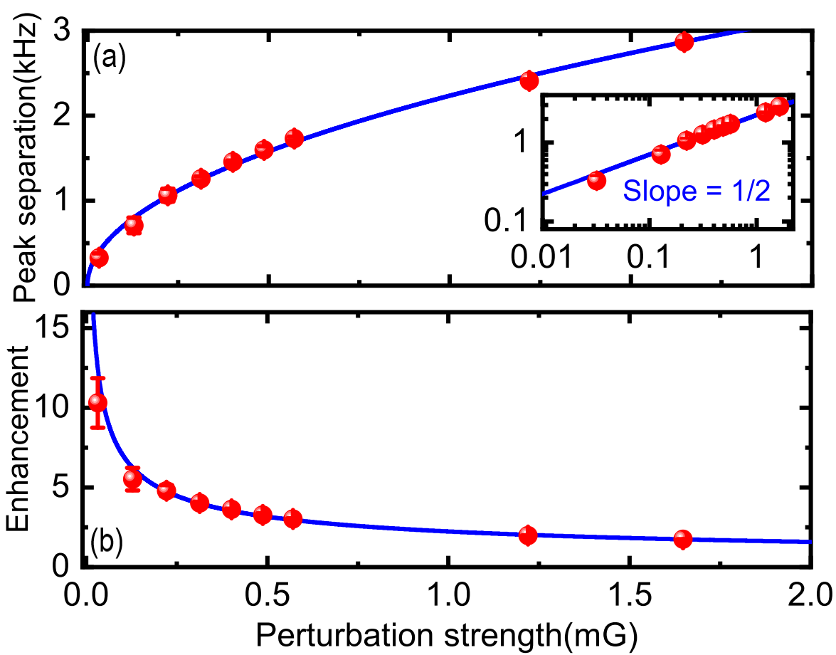Fig 2 (a) The observed peak separation of OPR magnitude as a function of the perturbation strength. (b) Measured enhancement as a function of the perturbation.