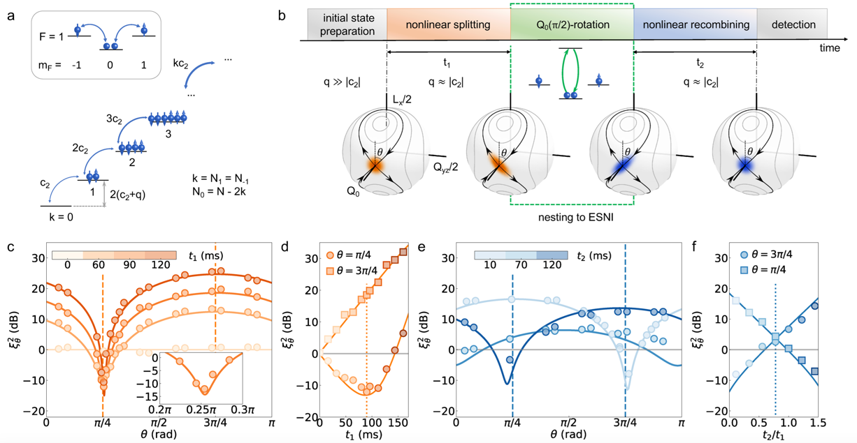 Figure 1. a, Structure of energy level in spin-1 atomic ensembles. b, schematic representation of effective time-reversal using state rotation. c-f, generation of spin-nematic squeezing and its effective time-reversal.