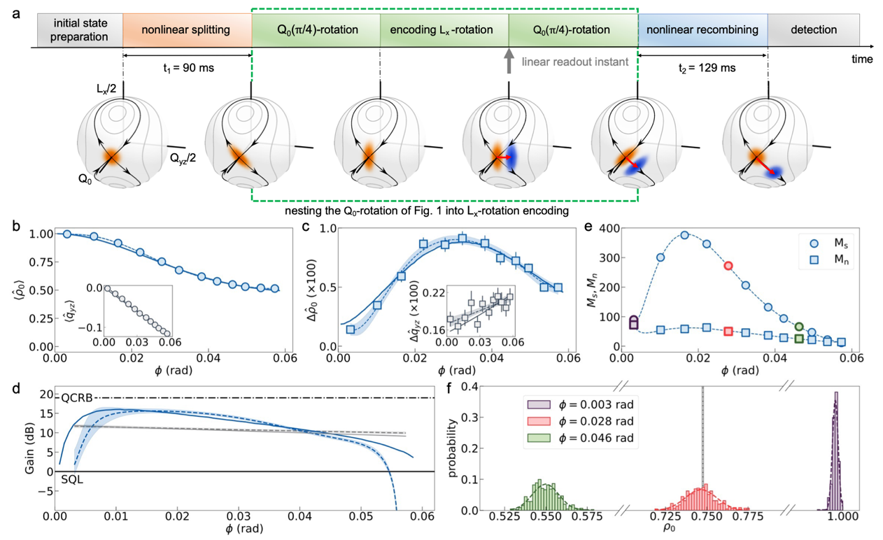 To quantitatively characterize the measurement precision of the interferometer, the researchers employed radio-frequency coupling to induce small-angle rotations in the experiments. By measuring the population of atoms in the m=0 state and utilizing error propagation formulas, they achieved a record sensitivity of 15.6±0.5 dB beyond the standard quantum limit (Figure 2). In comparison to linear readout results (11.7±0.3 dB), this method effectively mitigated the impact of detection noise.