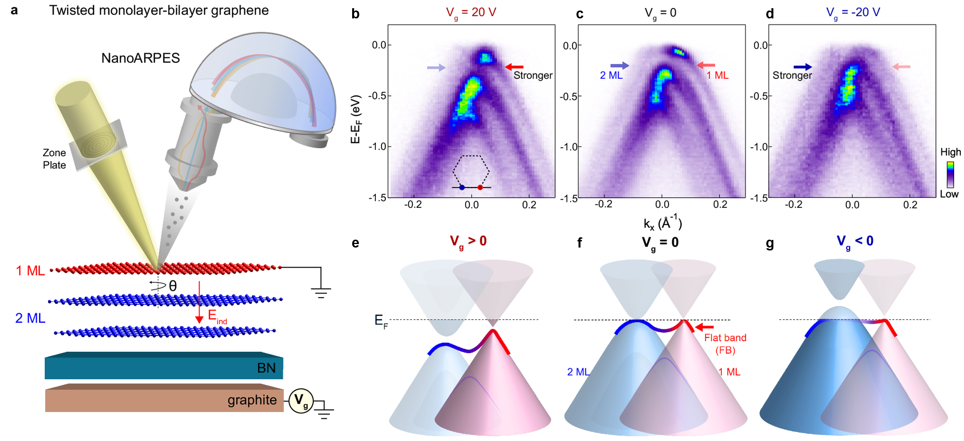 Twisted bilayer graphene has attracted much attention because it exhibits a series of novel correlated phenomena near the magic angle, such as unconventional superconductivity, Mott insulation, magnetism, etc. Its center physics is derived from the flat band electronic structure near Fermi energy, so the detection and engineering of the flat band electronic structure is the key to understand the related physics of the twisted system. Following the recent report in Nature Materials on the evolution of the flat band electronic structure of twisted bilayer graphene with twist angle, Shuyun Zhou's group recently extended the flat band study to twisted monolayer-bilayer graphene, and by applying in situ. gate voltage control method, they further achieve the field-tunable electronic structure in twisted monolayer-bilayer graphene. It is the first time to reveal the dichotomic field-tunable electronic structure in the twisted monolayer-bilayer graphene, that is, by changing the direction of the electric field, the flat band electronic structure more reflects the characteristics of monolayer and bilayer graphene.The research work is entitled "Observation of dichotomic field-tunable electronic structure in twisted monolayer-bilayer graphene," published in Nature Communications.