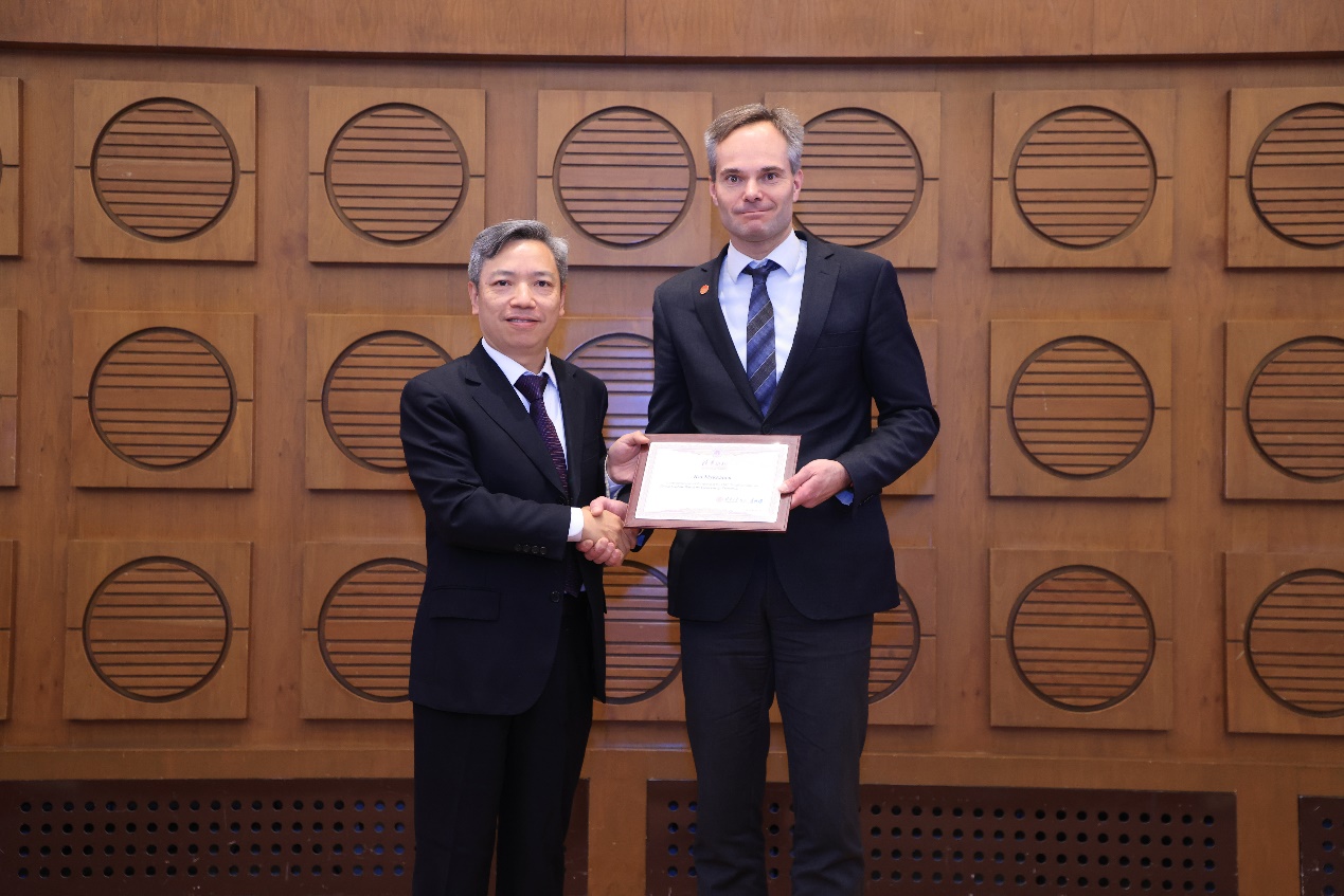 At the conclusion of the Forum, Wang Can presented a Commemorative Certificate of Tsinghua Forum to Minister Mykkänen.