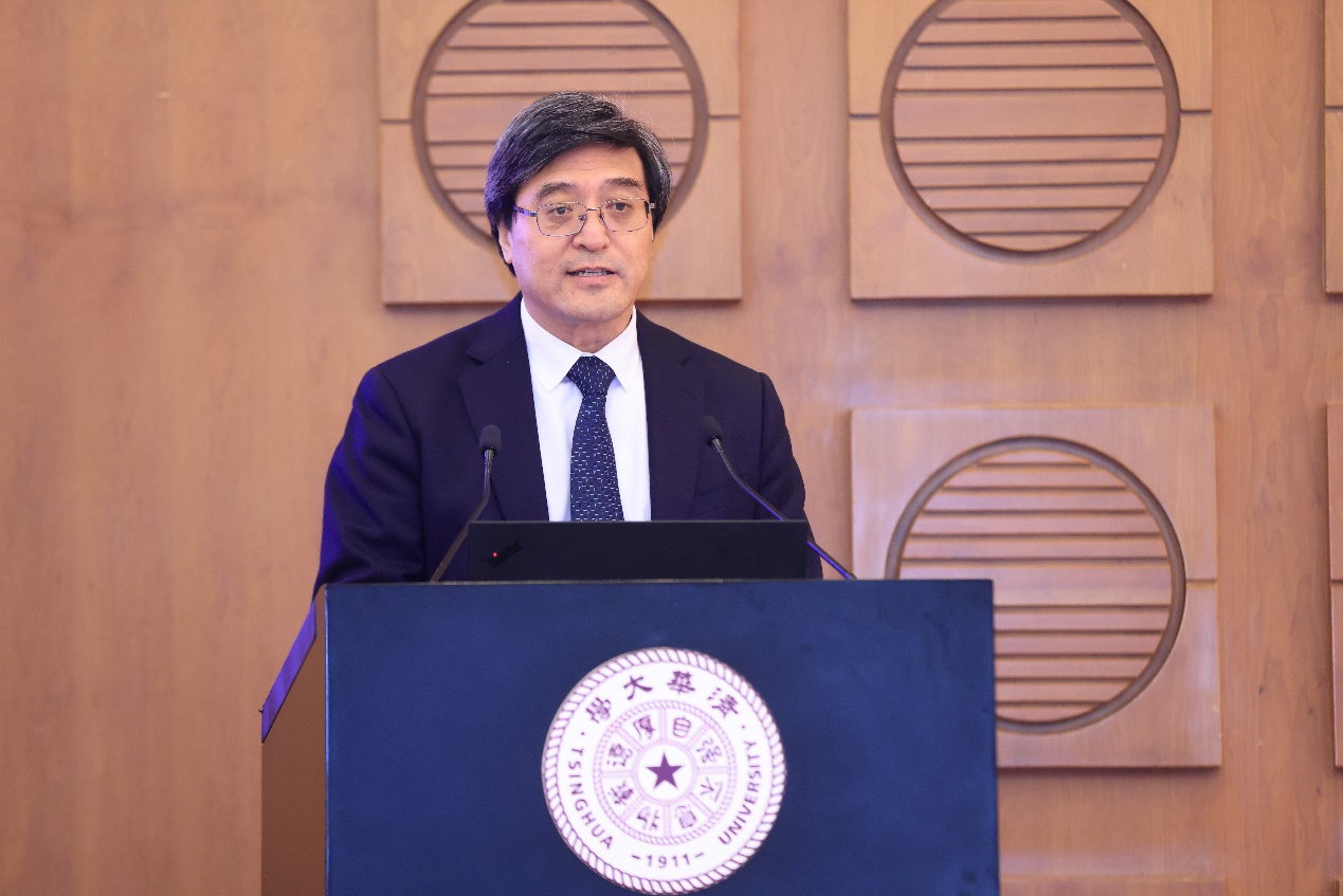 Tsinghua University Vice President Jiang Peixue delivers opening remarks at the 110th Tsinghua Forum