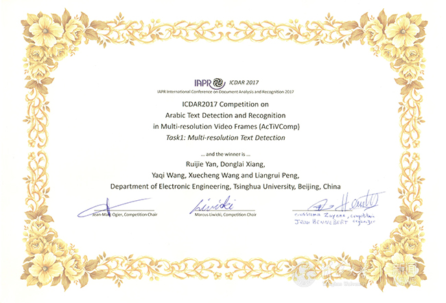 Recently, the International Conference on Document Analysis and Recognition (ICDAR 2017) was held in Kyoto, Japan. The results of the first Arabic Video Text Detection and Recognition Competition were announced, and Associate Professor Peng Liangrui together with her research group from the Department of Electronic Engineering at Tsinghua University were champions in the seven sub-tasks of text detection, and in three of the seven sub-tasks of text recognition.