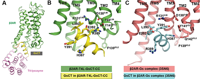 Figure 2. Overall β2AR-T4L-GsCT-CC structure and alternative interaction between GsCT and β2AR compared to the β2AR-Gs complex structure (3SN6).