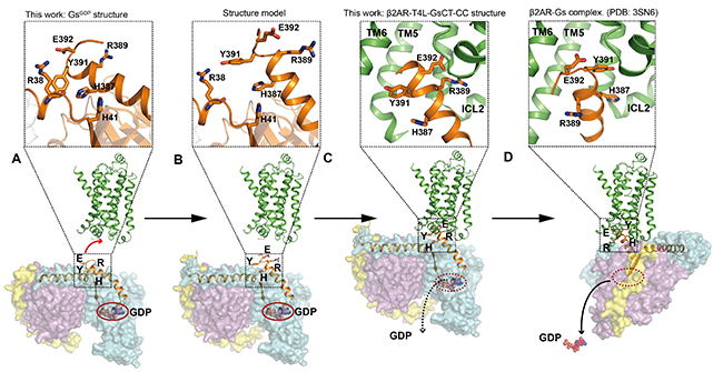 They then solved the GDP-bound Gs heterotrimer structure (GsGDP) at 2.8 A resolution. In the GsGDP structure, Y391Gαs and H387Gαs form intermolecular interactions with other residues in Gαs while E392Gαs and R389Gαs are exposed to the protein surface, which suggests E392Gαs and R389Gαs are more likely to involve in the initial interaction with the β2AR. They subsequently confirmed the important roles of E392Gαs and R389Gαs in efficiently β2AR-Gs complex formation by mutagenesis studies. Finally they proposed a model of the dynamic process of the GPCR-G protein complex formation from separated β2AR and GsGDP to the β2AR-GsGDP complex and eventually to the β2AR-Gsempty complex (Figure 3). They also provided evidence that this intermediate state complex contributes to the G protein coupling specificity.