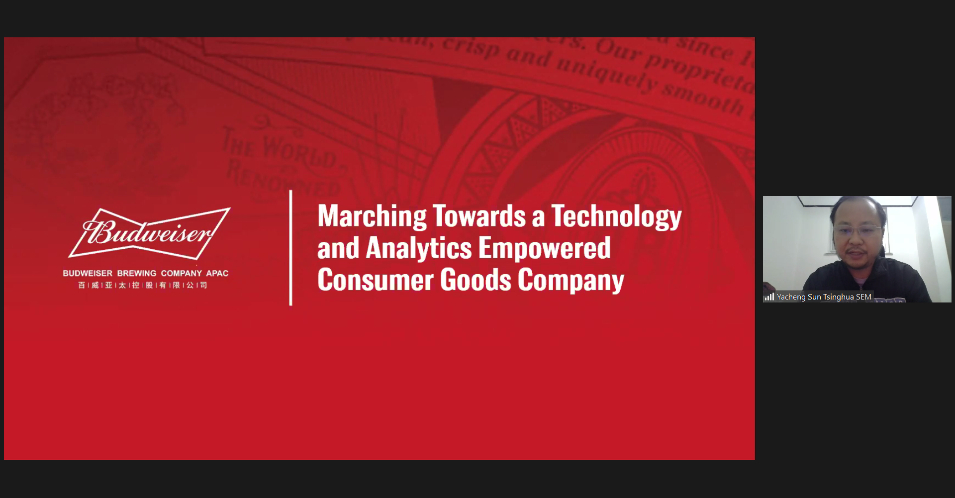 The Master in Management Program (MiM) of Tsinghua School of Economics and Management (Tsinghua SEM) invited Wouter Peeters, Vice President of Technology & Analytics at Budweiser Brewing Company APAC, and his team to host a virtual skill seminar titled“Marching towards a Technology and Analytics Empowered Consumer Goods Company”on May 13.
