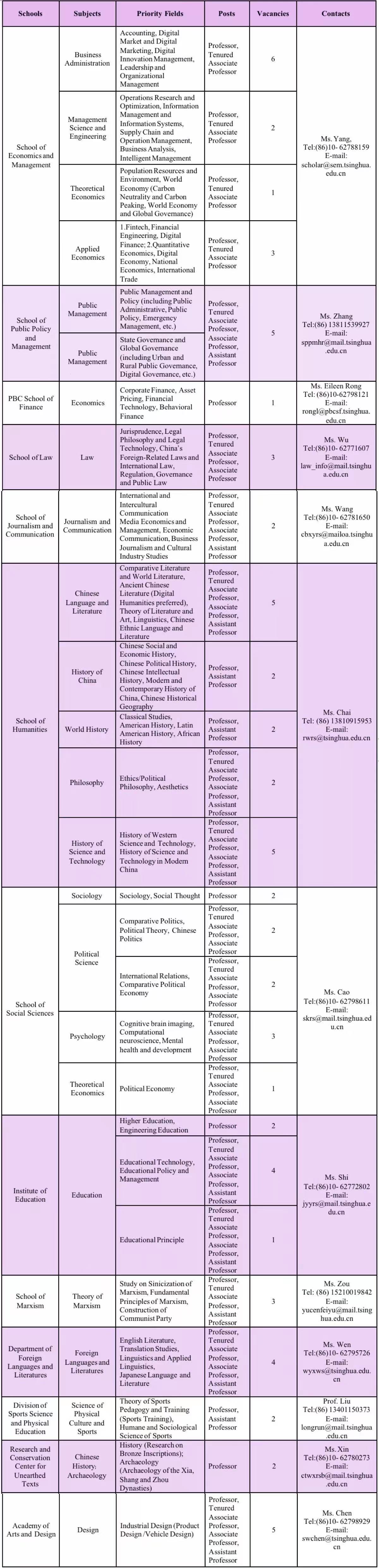 The recruitment targets mainly distinguished and outstanding scholars. We plan to recruit prominent academics with remarkable scholarly records to join Tsinghua as tenured professors, as well as tenure-track assistant and associate professors in some disciplines (as shown in the list of positions attached below). We will conduct open searches across all fields of humanities and social sciences.