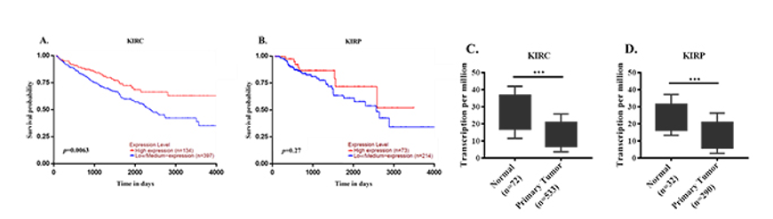 Effect of HMGCR expression level on kidney cancer patient survival. (A) Kidney renal clear cell carcinoma (KIRC) and (B) kidney renal papillary cell carcinoma (KIRP). Expression of HMGCR in primary tumor samples and normal kidney tissue. (C) Kidney renal clear cell carcinoma and (D) kidney renal papillary cell carcinoma.