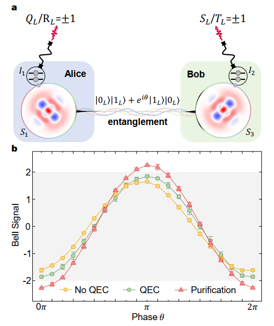 Specifically, the research team achieved binomial encoding of logical qubits in two spatially separated bosonic modes, establishing entanglement between the two logical qubits (Fig.1). Different form the entanglement between physical qubits, the entanglement between logical qubits exhibits stronger robustness to local noise, and it can be restored by local quantum error correction operations rather than dissipating directly into the environment. The research team protected entangled logical qubits through repetitive quantum error correction, resulting in a 45% improvement in the coherence time of the entangled logical qubits compared with their unprotected counterparts (Fig.2). Moreover, the research team demonstrated, for the first time, that entangled logical qubits can violate Bell inequalities through error detection and purification (Fig.3).