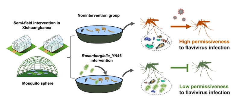 Researchers conducted a semi-field investigation to evaluate the efficacy of disrupting Rosenbergiella_YN46 within the environment of a region with high dengue incidence in blocking the transmission of dengue virus by local mosquitoes. Xishuangbanna (21°31′8.77″N, 101°36′22.89″E) was selected as the study site, where a controlled mosquito habitat was established utilizing local soil and water. Subsequently, a bacterial intervention involving Rosenbergiella_YN46 was introduced into the breeding water to monitor the infection rate of dengue virus among the hatched mosquitoes.