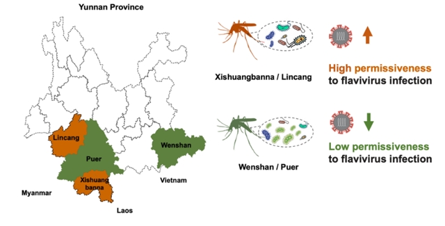 Researchers collected mosquitoes from these four areas with similar environmental factors and analyzed Rosenbergiella_YN46 colonization in their guts. Results revealed a high colonization rate of Rosenbergiella_YN46 in Wenshan and Puer (low dengue-incidence areas) and a low colonization rate in Xishuangbanna and Lincang (high dengue-incidence regions). This correlation suggests that the distribution and colonization of Rosenbergiella_YN46 are closely linked to the dengue-endemic regions in Yunnan.