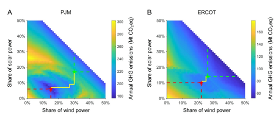 In modelling of PJM, when wind-only renewable energy sources reached 17% of power penetration, or solar-only renewable energy sources reached 13%, they triggered nuclear retirement and increased fossil-fuel use, resulting in higher greenhouse gas emissions.