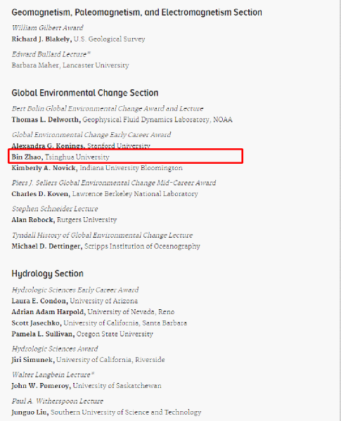 Zhao Bin from School of Environment, Tsinghua University received the Global Environmental Change Early Career Award from American Geophysical Union