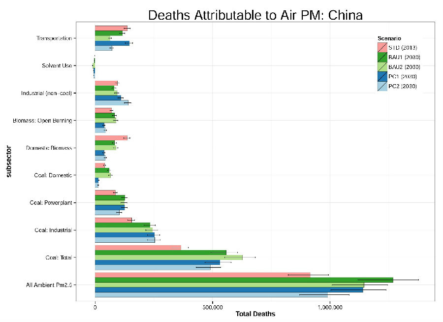 “Coal-burning was the most important contributor to ambient PM2.5, causing an estimated 366,000 premature deaths in 2013,” according to Professor Wang Shuxiao of Tsinghua University, and a lead investigator for the study.  In addition, she noted that “industrial sources and household solid fuel combustion, from both coal and non-coal emissions, were the largest sectoral contributors to disease burden attributable to ambient PM2.5 in China, responsible for 250,000 and 177,000 premature deaths, respectively.”