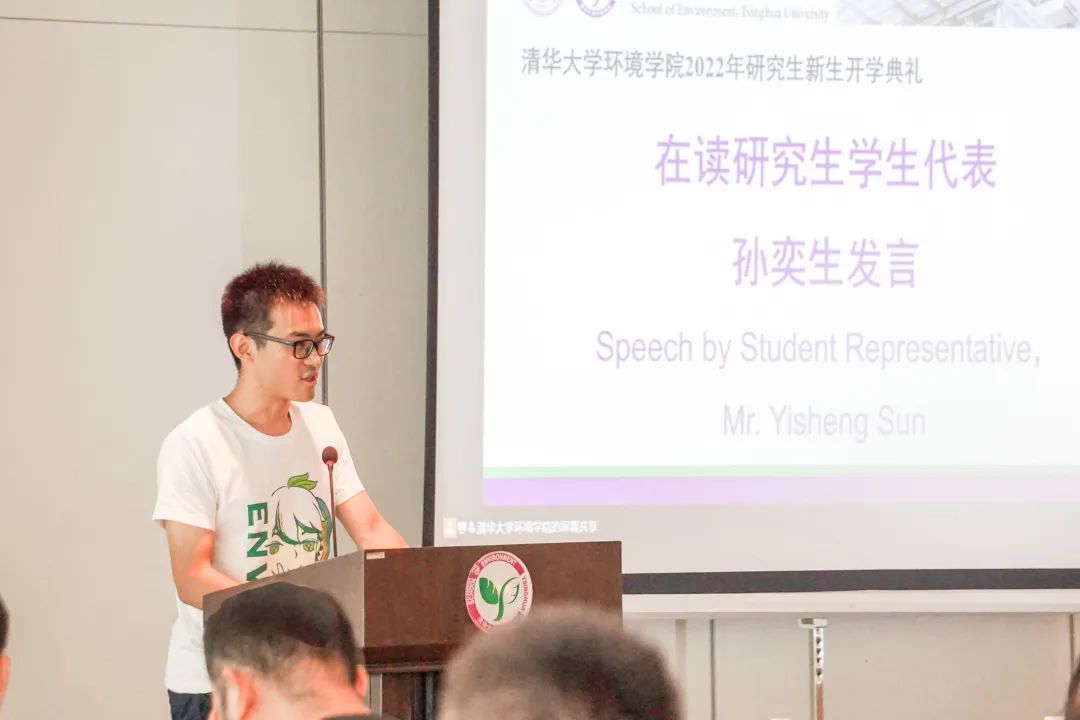 Sun Yisheng, a doctoral student of the Class of 2020, gave a speech on behalf on current postgraduates, sharing his experience of participating in the Beijing Winter Olympics, and his social practice and volunteer services in Pingyao, Shanxi. He encouraged everyone to be upright, pay attention to the real world, and care for others. Shakeel Ahmad, a doctoral student of the Class of 2018 and representative of international students, recounted his growth in Pakistan and his study experience at Tsinghua University, expressing his passion and respect for the cause of environmental protection. He hoped that his fellow students would make continuous progress, gain achievements, and thrive on the beautiful Tsinghua campus. Li Yue, the new student representative, said that they new students have prepared themselves to face the unknown challenges in their research journey. They will keep the SOE motto “Passion for Our Environment, Ambition for Our Cause” in mind, uphold Tsinghua University's excellent tradition of “actions speak louder than words”, devote to the cause of environmental protection, and keep abreast with the time.