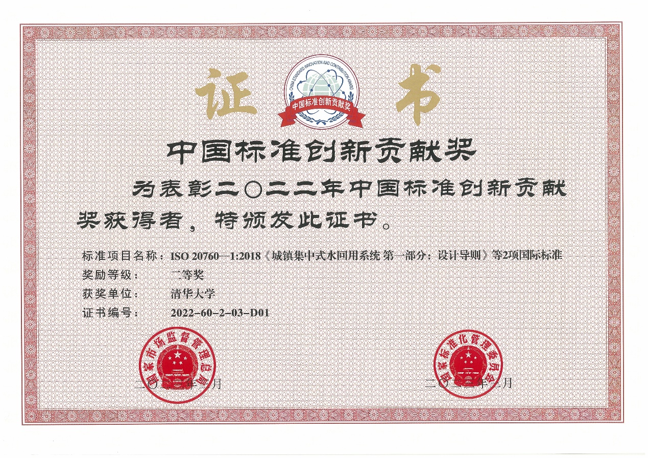 Recently, the State Administration for Market Regulation of China announced the winners of the China Standards Innovation and Contribution Award 2022. The ISO international standard Water reuse in urban areas — Guidelines for centralized water reuse system, led by Professor Hu Hongying's team from the School of Environment at Tsinghua University, was awarded the second prize for Standard Project in the China Standards Innovation and Contribution Award 2022.