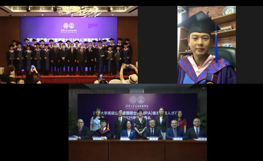 公管学院副院长、学位分委员会副主席、EMPA项目负责人王亚华,学位分委员会主席程文浩,EMPA项目主任潘洁以及相关负责人在北京主会场参加典礼。在香港分会场出席典礼的嘉宾包括中央政府驻香港联络办公室代表及信和集团社区事务部总经理邱文华。首届毕业生尚海龙在香港分会场协助主持典礼。