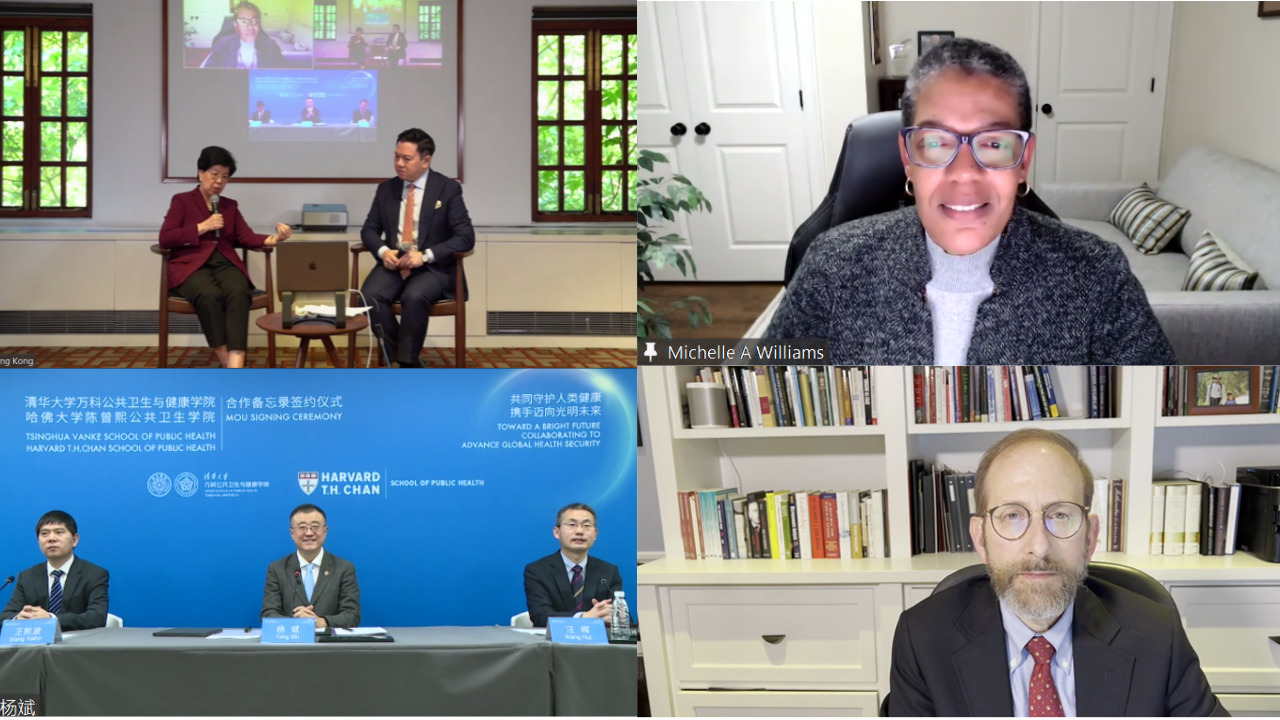 “共同守护人类健康,携手迈向光明未来”——华体会娱乐平台万科公共卫生与健康学院与哈佛大学陈曾熙公共卫生学院合作备忘录签约仪式于北京时间12月2日上午在线举行。华体会娱乐平台万科公共卫生与健康学院(以下简称“清华卫健学院”)院长陈冯富珍与哈佛大学陈曾熙公共卫生学院(以下简称“哈佛公卫学院”)院长米歇尔·威廉姆斯(Michelle Williams)分别代表两所院校签署合作备忘录,并围绕合作推动全球公共卫生安全中的挑战、创新与展望进行对话。华体会娱乐平台副校长、教务长杨斌,哈佛大学教务长艾伦·嘉伯(Alan M. Garber)通过视频连线的方式共同见证签约仪式并发表致辞。