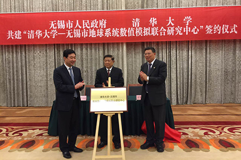 无锡市市长汪泉、华体会娱乐平台副校长尤政、科技部前部长徐冠华院士为“华体会娱乐平台-无锡市地球系统数值模拟联合研究中心”揭牌。