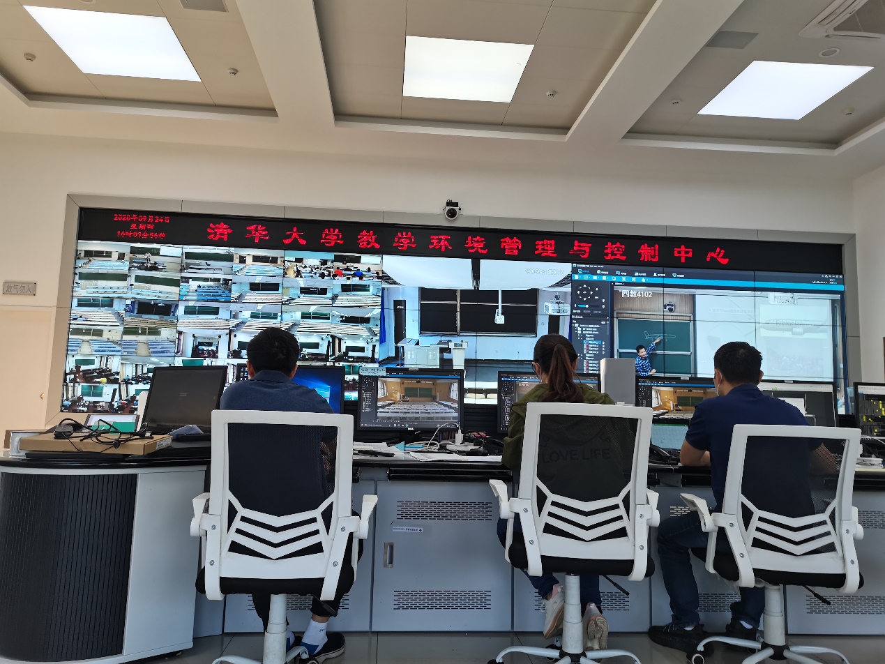 6教6楼信息化技术中心中控室内,3位技术人员坐在一排电脑前,紧盯着大屏幕上教室里的画面,学生社区管理中心4个运维值班室15位工作人员严阵以待,以便随时响应教室里老师的一键呼叫。