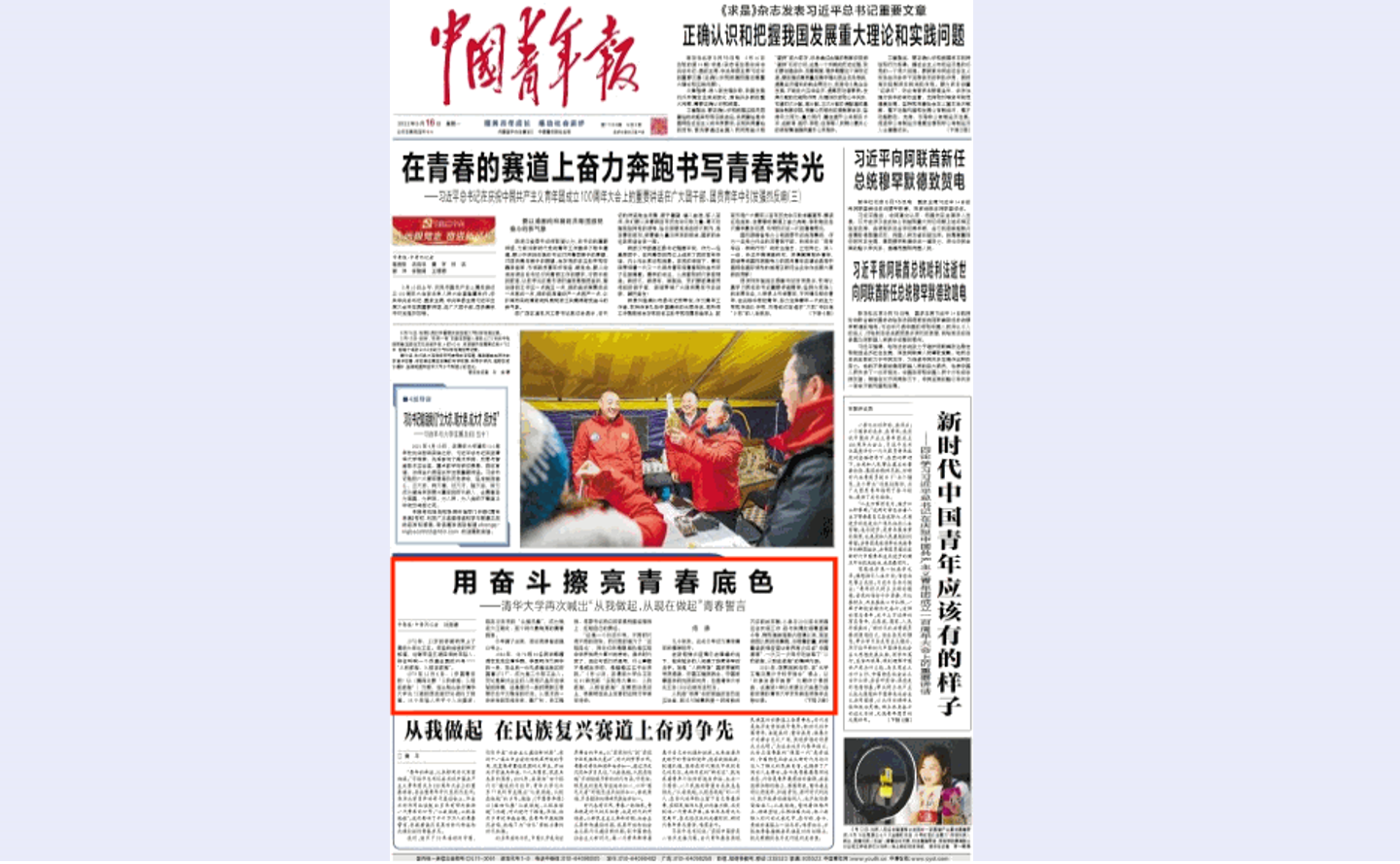 今天,《中国青年报》在头版刊登题为《用奋斗擦亮青春底色——华体会娱乐平台再次喊出“从我做起,从现在做起”青春誓言》报道。特全文刊载,以飨读者。