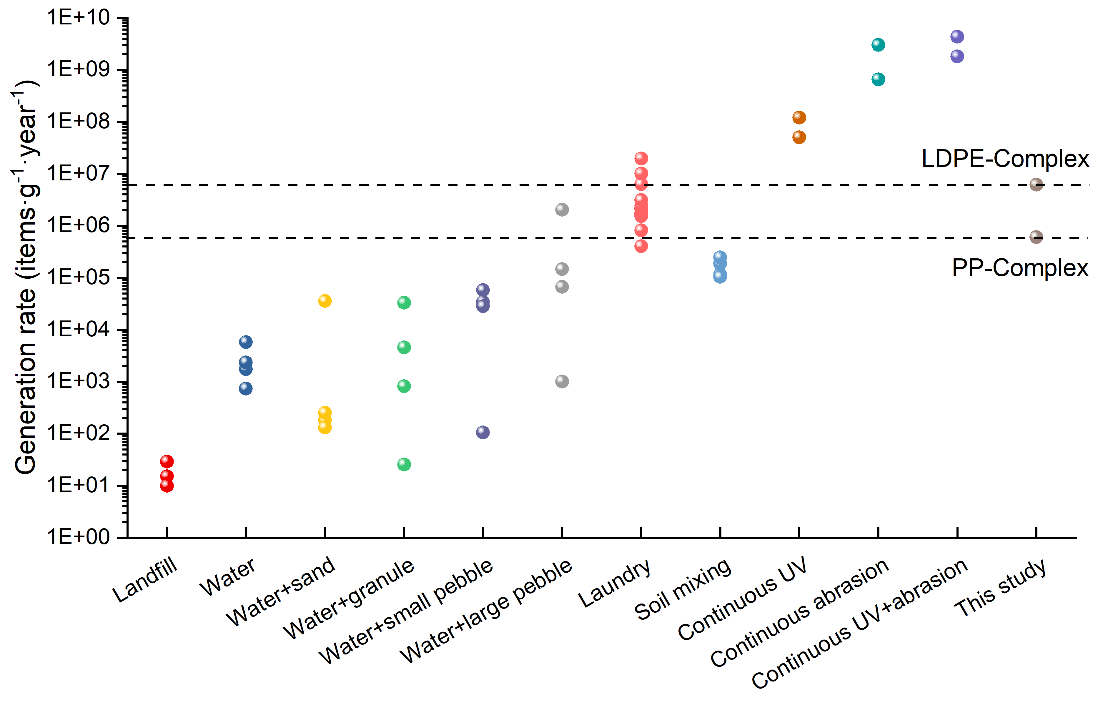 研究团队在实验室内通过干湿循环实验,探究了塑岩释放微纳米塑料的能力。与利用吹膜法制备的相同厚度塑料薄膜相比,相同循环次数下塑岩中的LDPE和PP可释放更多微塑料颗粒。微塑料的释放过程遵从零级动力学,显示出持续的微塑料释放能力。10次干湿循环过程中,LDPE与PP分别可累积释放1.03×108个/m2、1.28×108个/m2微塑料颗粒(图4),其释放速率比文献报告的垃圾填埋场、海洋环境下微塑料的释放速率高2个数量级以上(图5)。除此之外,干湿循环同样造成了纳米塑料的释放。NTA表征结果显示,单次干湿循环即可从塑岩结合的LDPE与PP中释放4.20×1012个/m2,9.01×1012个/m2纳米塑料颗粒(图6)。在全球变化的大背景下,洪水泛滥事件造成的干湿循环频次增加,这一塑料的赋存形式与其他赋存形式相比,存在较高的生态风险。这一发现是塑料这一人造材料进入自然界地质循环过程的直接证据,阐释了塑料制品在环境中一种新的风险机制与归趋。