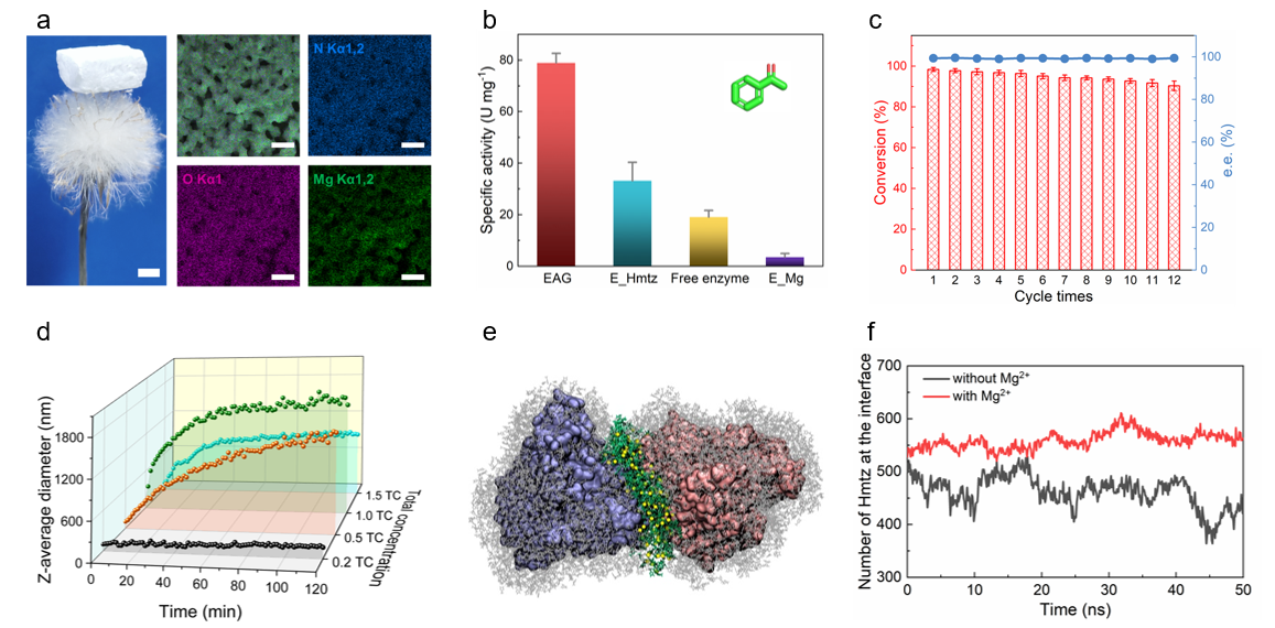 图2.酶自聚水凝胶的性能与机制解析。(a)宏微观特性;(b)催化不对称还原反应的活性比较;(c)重复使用性;(d)原位生长过程监测;(e)桥接界面;(f)镁离子对界面稳定性的影响