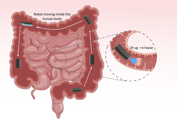 论文建立了基于磁气混合驱动软体机器人的仿生运动步态理论模型、驱动与控制方案,实现了对磁气混合驱动机器人的快速精确控制。同时在结构设计、充磁方案、驱动控制时序等方面进行了研究,大大提升了机器人的运动性能,实现了机器人在不同复杂场景的应用。在临床应用方面,实现了机器人术中影像采集、自主运动及药物输送等功能,展现出了极大的临床医学应用潜力。该技术有望应用于微创手术及经自然腔道手术,并辅助医生完成快速、高效、精准的术中诊断及治疗操作。