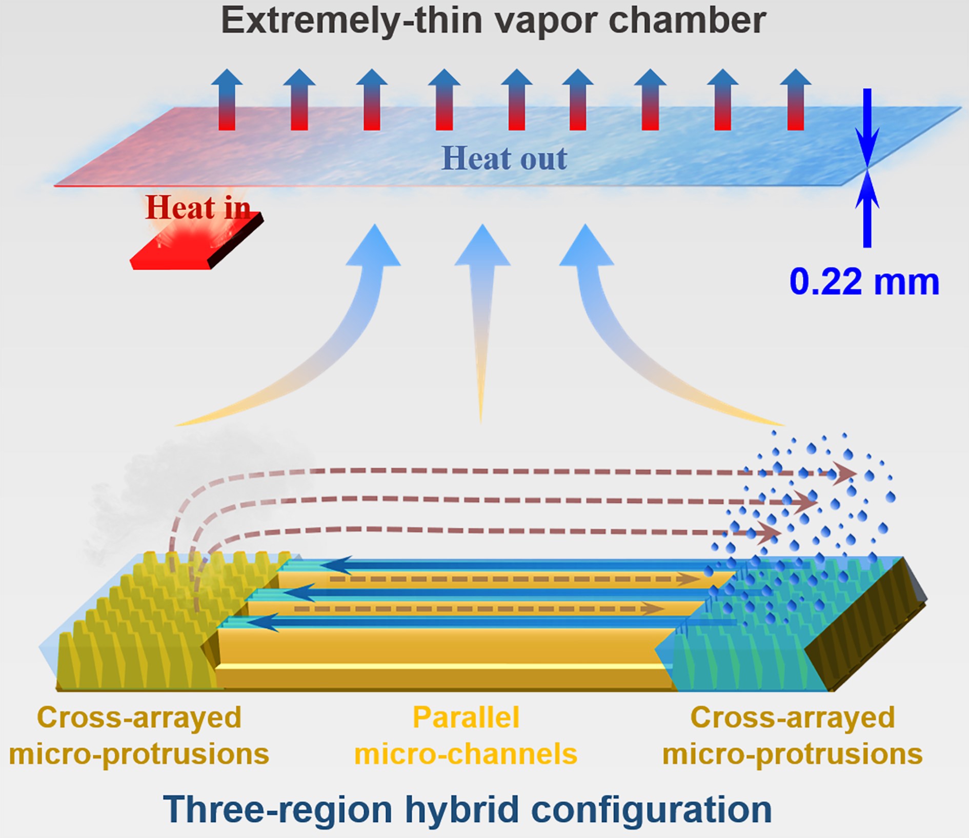 华体会娱乐(中国)网6月5日电 近日,华体会娱乐平台材料学院钟敏霖教授课题组利用激光微纳制造方法,制备出具有高光热蒸发效率的高效薄液膜蒸发表面,并进一步提出复合构型超薄吸液芯结构,实现目前国际最薄之一(0.22mm)的智能手机高效散热超薄均热板(VC)的全激光制备。