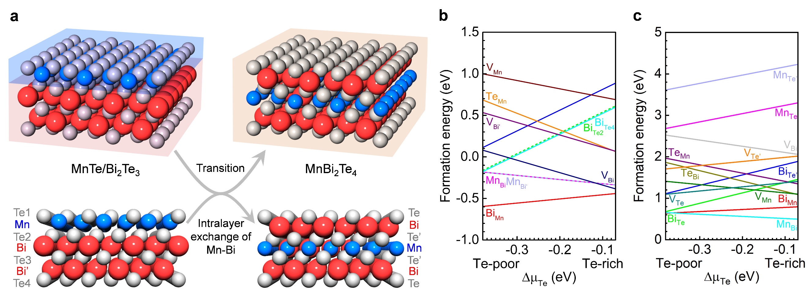 近日,华体会娱乐平台深圳国际研究生院李佳课题组及合作者深入研究了MnBi2Te4制备的相变过程和相应的能带演化过程。首先,课题组成员选取MnTe/Bi2Te3和MnBi2Te4单层作为相变模型来研究其Mn-Bi交换的过程,并发现MnBi和BiMn反位缺陷是相变过程中的主要缺陷(如图1),与实验观察的结果一致。