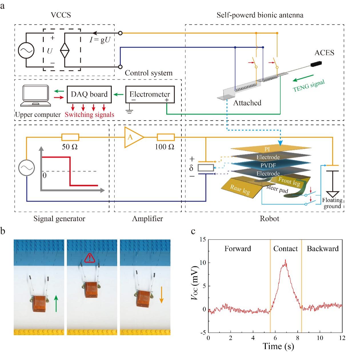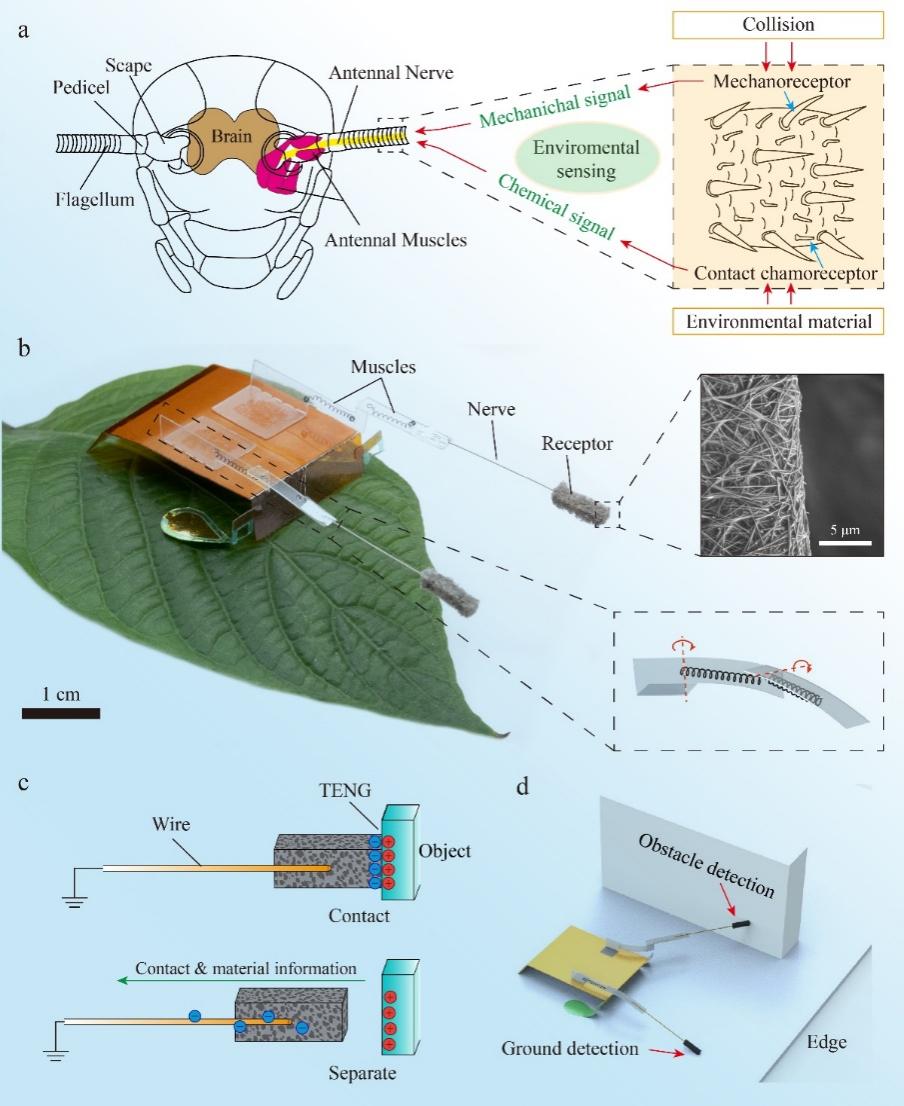近日,华体会娱乐平台深圳国际研究院张旻、王晓浩团队受自然界中昆虫触角的启发,提出了一种基于摩擦纳米发电机(TENG)的自供电仿生触角传感器(SBA),用于微型机器人的自主环境感知,辅助微型机器人进行障碍躲避和地形预判。该仿生触角主要由感受器、硬质导线和执行器单元三个部分组成,分别模拟了昆虫触角中的机械/接触化学感受器、神经纤维和肌肉纤维(图1),完成接触感知、信号传导和驱动工作。
