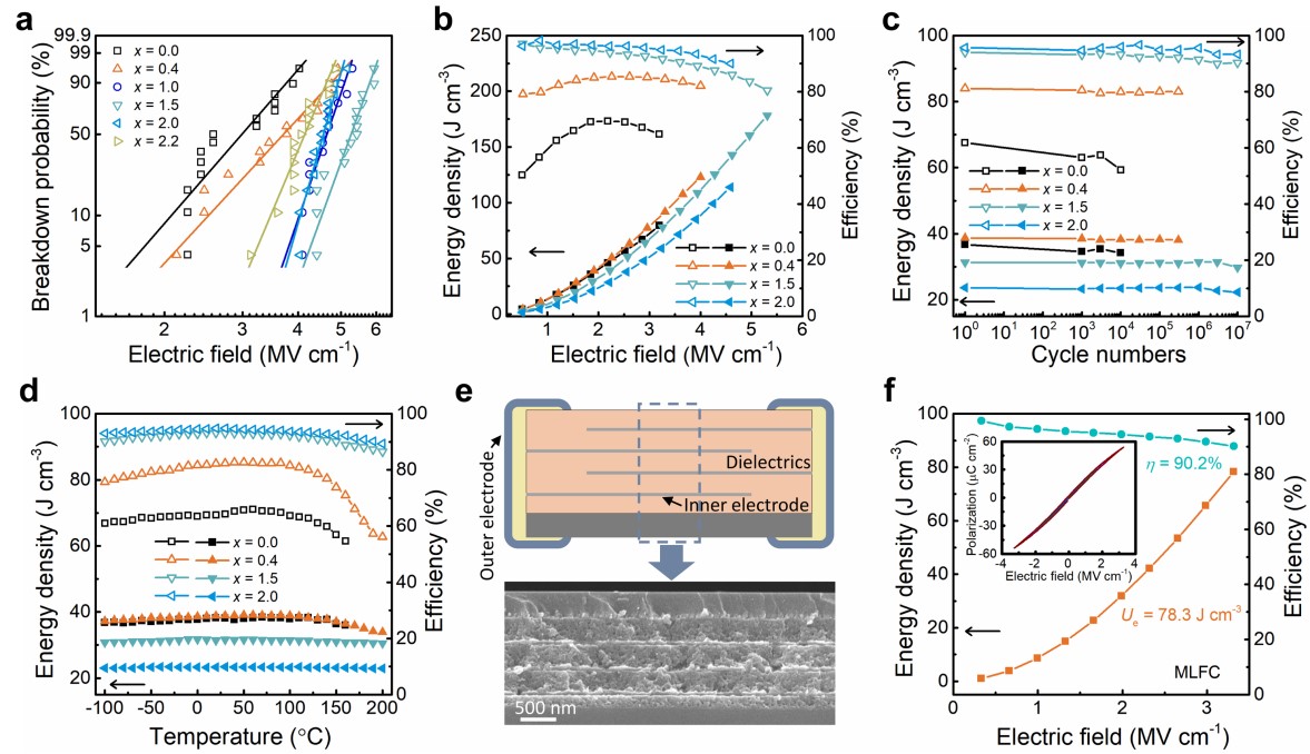 由于熵带来的成分无序和结构无序增加,导致材料的弛豫性增加,极化回滞减小,最终优化出了最佳的储能区间(图3g-i)是中熵,和模拟计算的结构一致。基于此,他们总结出熵-成分异质性-弛豫度的关联,进而将有助于在实验上更加有效地指导弛豫铁电体的设计,实现更佳的性能。最终在中熵的弛豫铁电体x=1.5的薄膜中实现了最优的储能性能,即储能密度为178.1 J cm-3,效率为80.5%,并且该薄膜还具有较好的充放电循环稳定性和宽温区的温度稳定性(图4a-d)。此外,基于中熵的成分,研究团队还尝试了多层薄膜电容器的制备,其相对于传统的流延制备的多层陶瓷电容器,显示了更高的储能性能(图4e-f)。