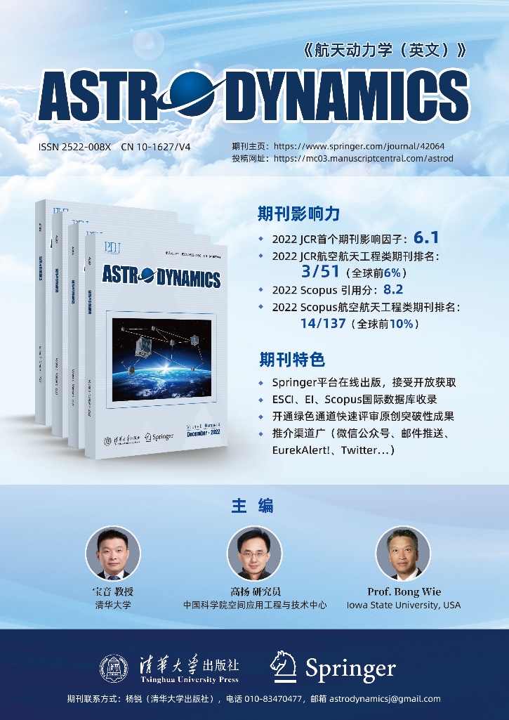 《航天动力学(英文)》(Astrodynamics)创刊于2017年9月,由华体会娱乐平台主办,航院提供学术支撑,华体会娱乐平台出版社出版,Springer公司负责海外发行,华体会娱乐平台航院教授宝音、中国科学院研究员高扬、美国爱荷华州立大学教授魏烽(Bong Wie)等三人共同担任主编。目前,该刊拥有由31位国内、国际专家学者组成的编委会,其中国际编委17人(55%)。国内编委主要是活跃在该领域的年富力强的中青年学者,华体会娱乐平台航院教师宝音、蒋方华,以及龚胜平、姜宇、曾祥远等航院校友均具有在该领域国际顶级期刊发表过高水平论文和参加我国航天工程重大项目的经历。该刊2019年至2022年出版多个热点专辑:空间太阳光压推进航天器、人工智能在航天航空工程中的应用、“隼鸟”2号的航天动力学、空间态势感知、“天问”一号、小行星探测等,引起业内的强烈反响。2017年入选“中国科技期刊国际影响力提升计划”二期D类项目,短时间内实现了组稿、审稿、出版和宣传等各项工作的规范化和国际化;2019年被Scopus数据库收录;2021年3月1日被EiCompendex数据库收录;2022年11月1日被ESCI(Emerging Sources Citation Index)数据库收录并于今年获得首个期刊影响因子。