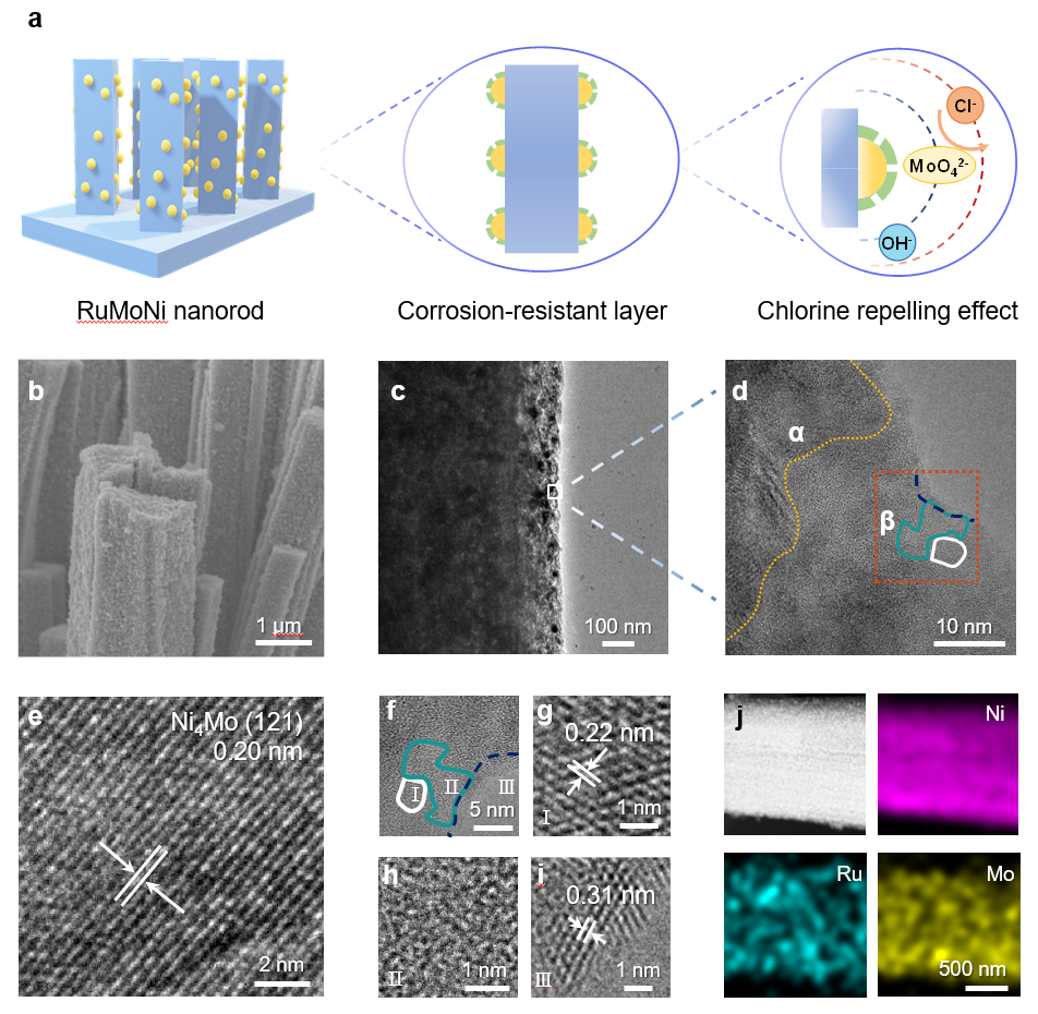 近日,华体会娱乐平台深圳国际研究生院刘碧录教授团队开发了一种高性能、耐腐蚀海水电解催化剂。研究人员通过水热法和电化学活化法制备了钌钼镍(RuMoNi)催化剂,这种催化剂由表面多孔纳米棒阵列组成。高分辨透射电镜表明该催化剂由镍钼合金(Ni4Mo)导电基底、氧化钌/羟基氧化镍(RuO2/NiOOH)活性相和钼酸镍(NiMoO4)抗腐蚀层构成。