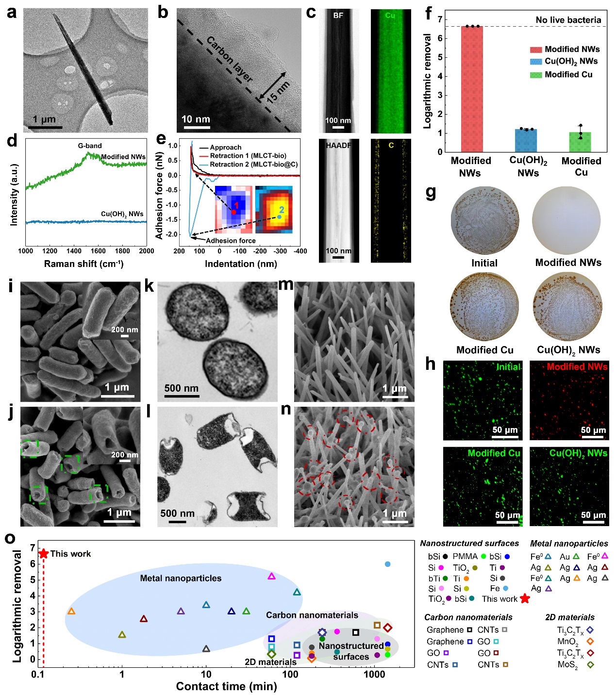研究人员利用多孔泡沫铜制备了碳包覆纳米线,当受污染水样流经该材料时,即可对水中细菌造成严重的机械破损(图2)。结合流场计算、细菌机械强度测试以及细菌受力有限元模拟,证实碳包覆纳米尖端的瞬时粘附-流场撕扯效应能够突破细菌的临界应力,而水流冲击下细菌与纳米尖端发生的碰撞作用不能破坏细菌。