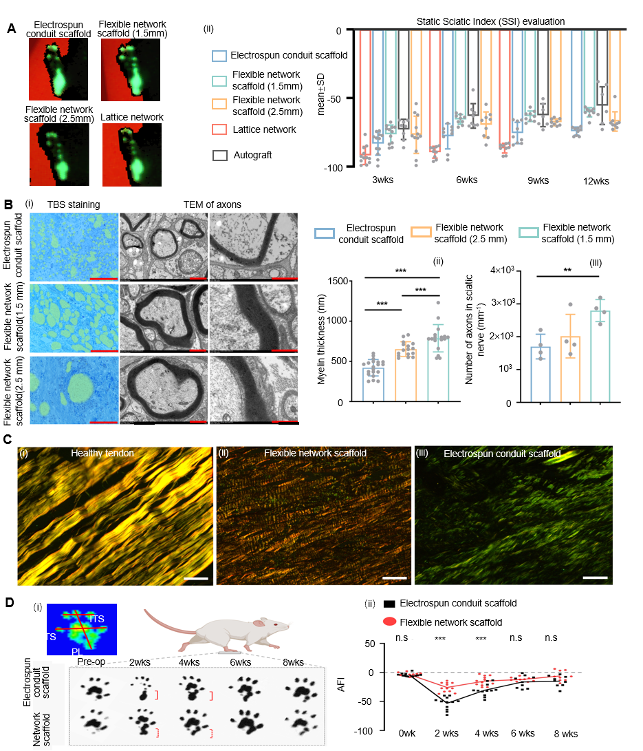 图2.柔性网状支架组与对照组关于大鼠损坐骨神经与肌腱损伤修复效果比较。A,大鼠坐骨神经缺损术后运动能力的恢复评价(3、6、9、12周);B,术后大鼠坐骨神经轴突再生质量评价(12周),比例尺:2微米;C,(i)健康肌腱,(ii)柔性网状支架中再生肌腱与(iii)传统纺丝管状支架中再生肌腱的天狼星红染色结果,比例尺:100微米;D,大鼠肌腱缺损术后运动能力的恢复评价(2、4、6、8周)