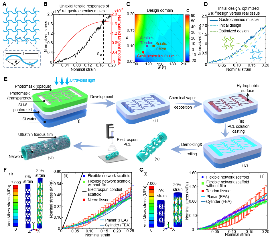 图1.A-C柔性网状支架的逆向设计思路;D柔性网状支架的制备流程;E用于坐骨神经修复的柔性网状支架(左为未覆膜样品,右为覆膜后样品),比例尺:800微米;F-G用于坐骨神经与肌腱修复柔性网状支架的有限元计算与实验结果,以及与真实生物软组织力学响应的对比