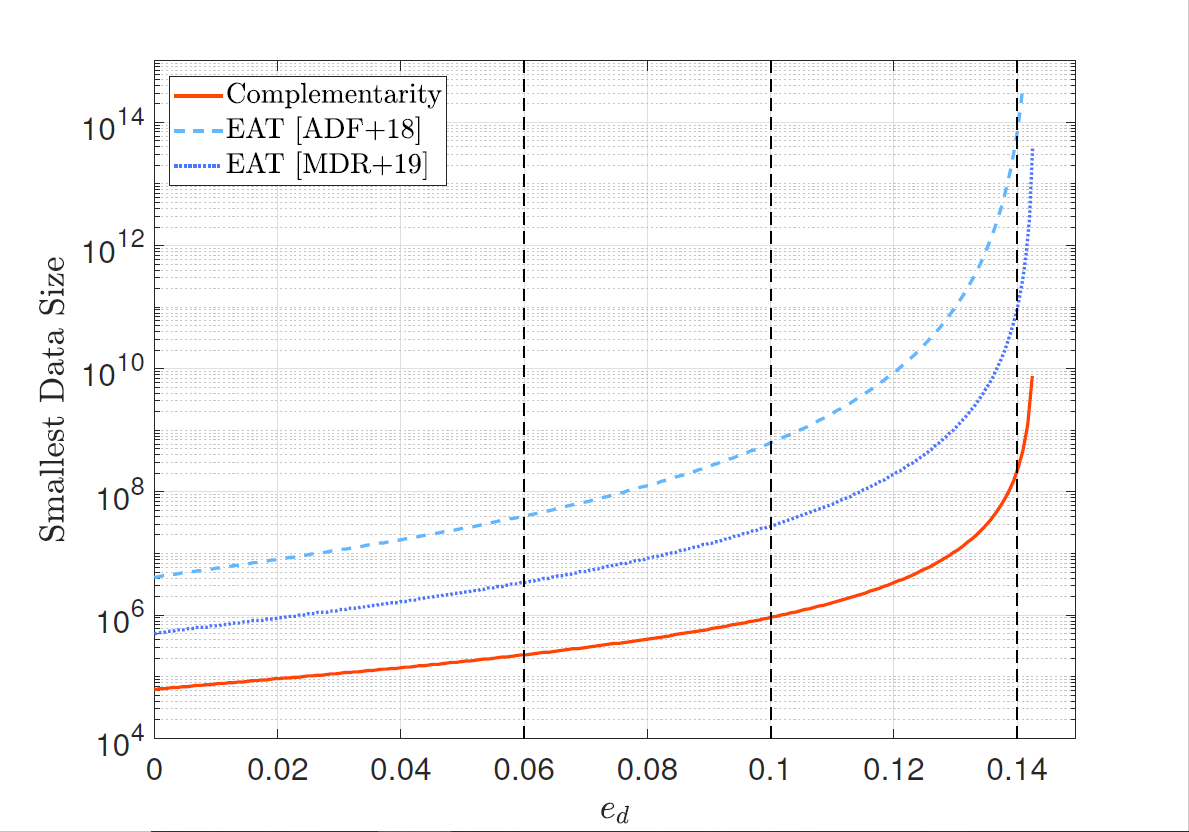基于对测量互补性原理作用的更好理解,新的安全性分析可以自然地与优势密钥提取等技术结合,并且显著降低了设备无关量子密码协议所需的数据量。通过重新分析基于离子阱平台实现的首个设备无关量子密钥分发实验演示的数据,新的分析方法可以将实验所需时间缩短至原先的三分之一。如图3所示,针对冷原子、金刚石色心等平台的合理实验参数,新方法较先前最优的分析方法的提升甚至可达2-3个数量级。这一结果对推进设备无关量子密码协议的实用化具有重要意义。