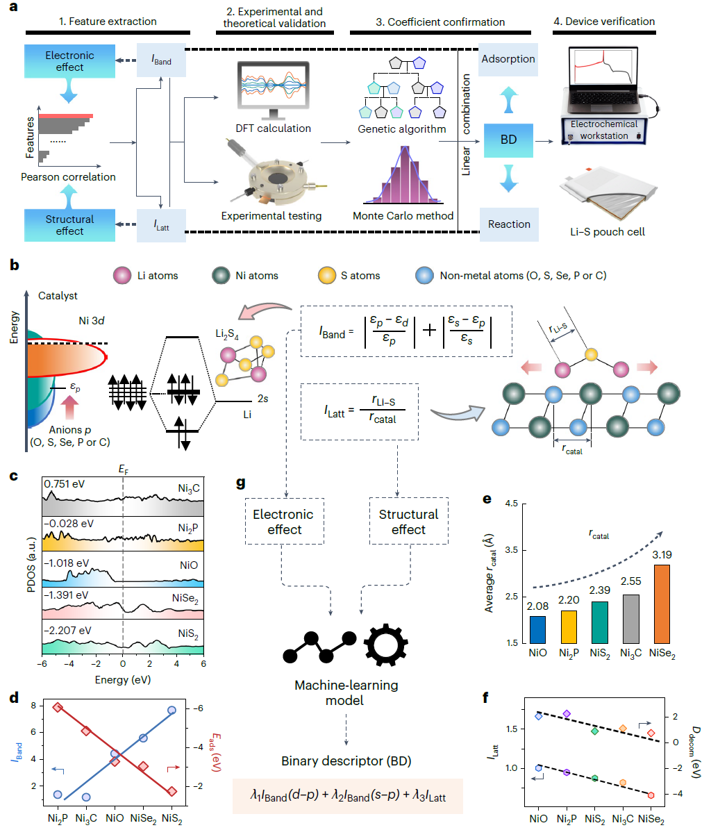 相关成果近日以“机器学习辅助设计二元描述符以破译硫反应动力学的电子和结构效应”(Machine-learning-assisted design of a binary descriptor to decipher electronic and structural effects on sulfur reduction kinetics)为题发表在《自然·催化》(Nature Catalysis)上。