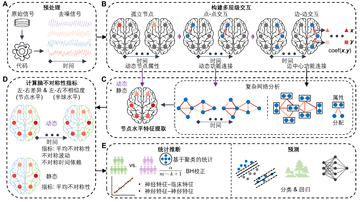 近日,华体会娱乐平台电子工程系多模态数据处理系统研究室窦维蓓教授和北京清华长庚医院康复医学科潘钰教授团队研究提出的多层级脑不对称性综合分析(CAMBA)框架(图1),将三个层级的脑交互整合到统一的脑不对称性分析管道,捕捉节点和半球水平的脑不对称性动态。该框架被应用于健康人,卒中患者基线,卒中患者下肢康复训练前后等三个静息态EEG数据集。该框架在三个交互层级分别度量了动态节点功率,动态功能连接和以边为中心的功能连接,并结合复杂网络分析,研究以下三个临床上关心的问题:(1)卒中对各层级脑交互和各频带的脑不对称性带来了什么影响?(2)不同下肢康复策略引起的脑不对称性的改变模式是什么样的?是否与临床行为评分相关?(3)基于基线时的临床和脑不对称性特征是否可以预测特定康复训练策略下的功能恢复?