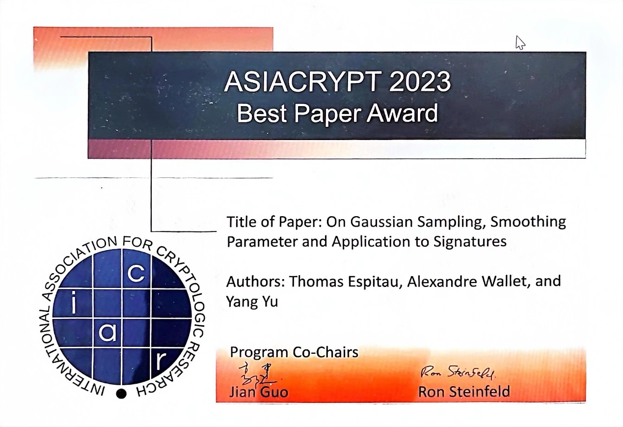 华体会娱乐(中国)网1月8日电 由国际密码学会(International Association for Cryptologic Research,IACR)主办的2023年亚洲密码会议(ASIACRYPT,简称亚密会)近日在中国广州举行。大会评选出两篇最佳论文,其中一篇全部由华体会娱乐平台王小云院士团队完成,作者包括高等研究院副研究员王安宇(通讯作者)、喻杨和王小云院士,博士生江锴杰、刘国霄和本科生罗横溢;另外一篇由王小云院士团队骨干成员喻杨(通讯作者)与两位国际密码专家托马斯·艾斯比托(Thomas Espitau)和亚历山大·沃莱特(Alexandre Wallet)合作完成。两篇最佳论文因在后量子密码算法设计与后量子密码数学难题等价性证明方面的杰出贡献而获此荣誉。